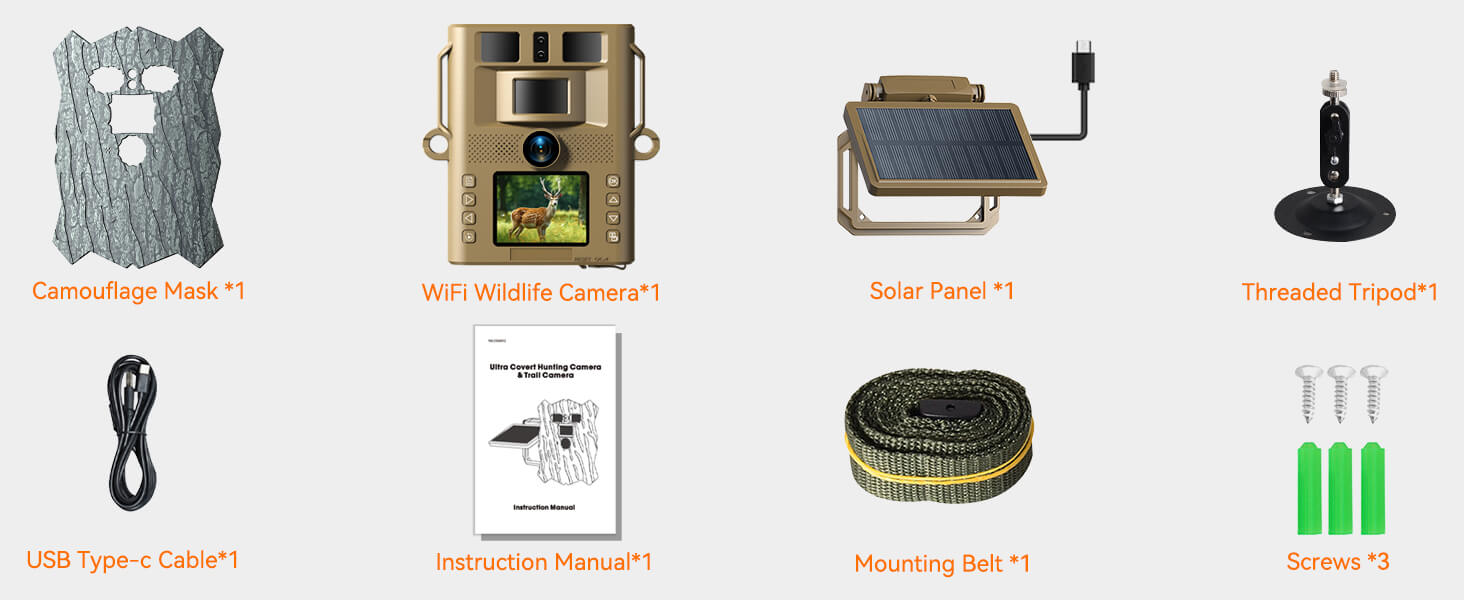 1*Mask +1*Wifi Trail Camera+1*Solar Panel+1*Threaded Tripod +1*Cable+1*Manual+1*Mounting Belt +3*Screws