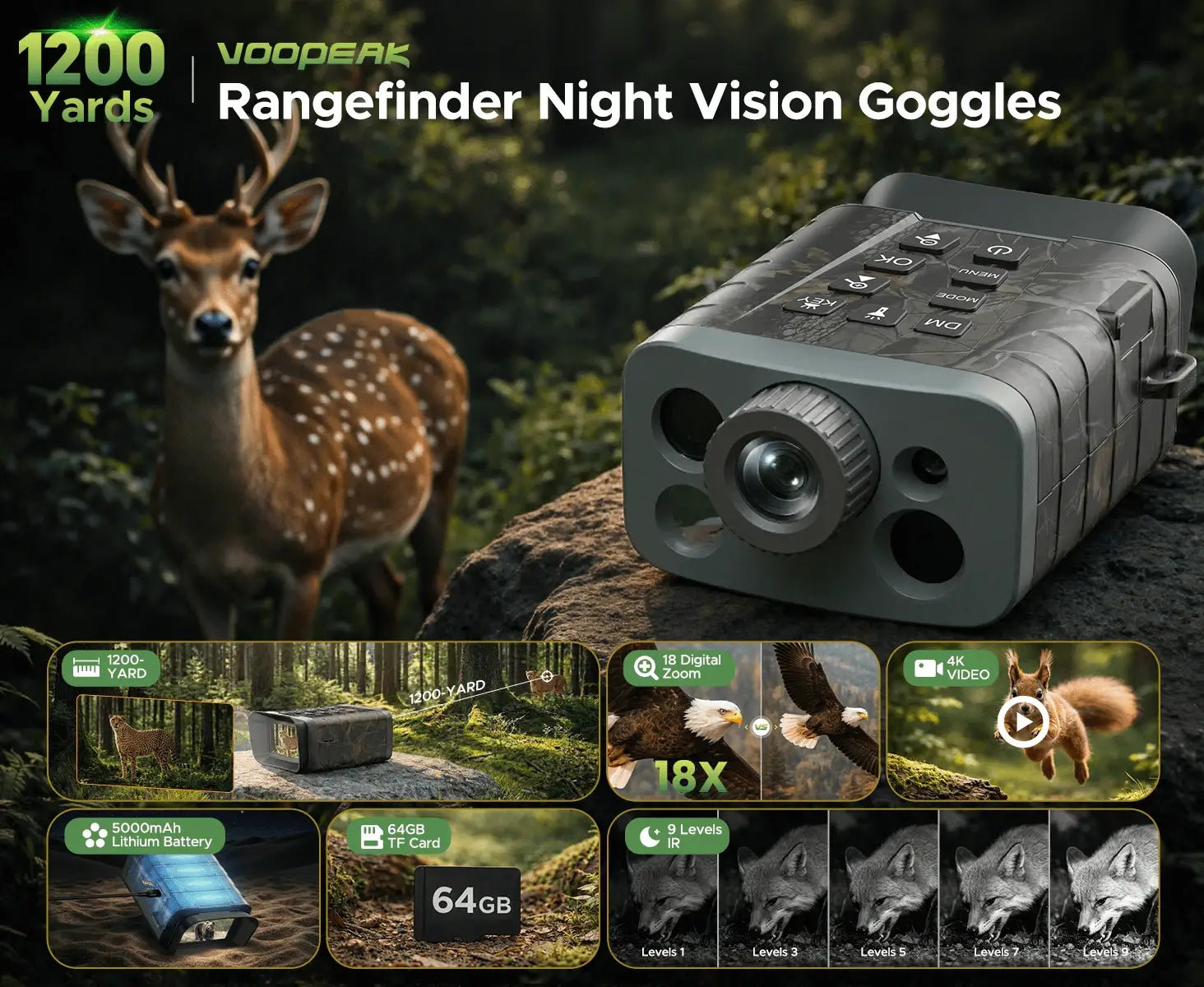 Voopeak 4K Night Vision Goggles with Rangefinder (Up to 1200Yd) 18X Zoom & 5000mAh