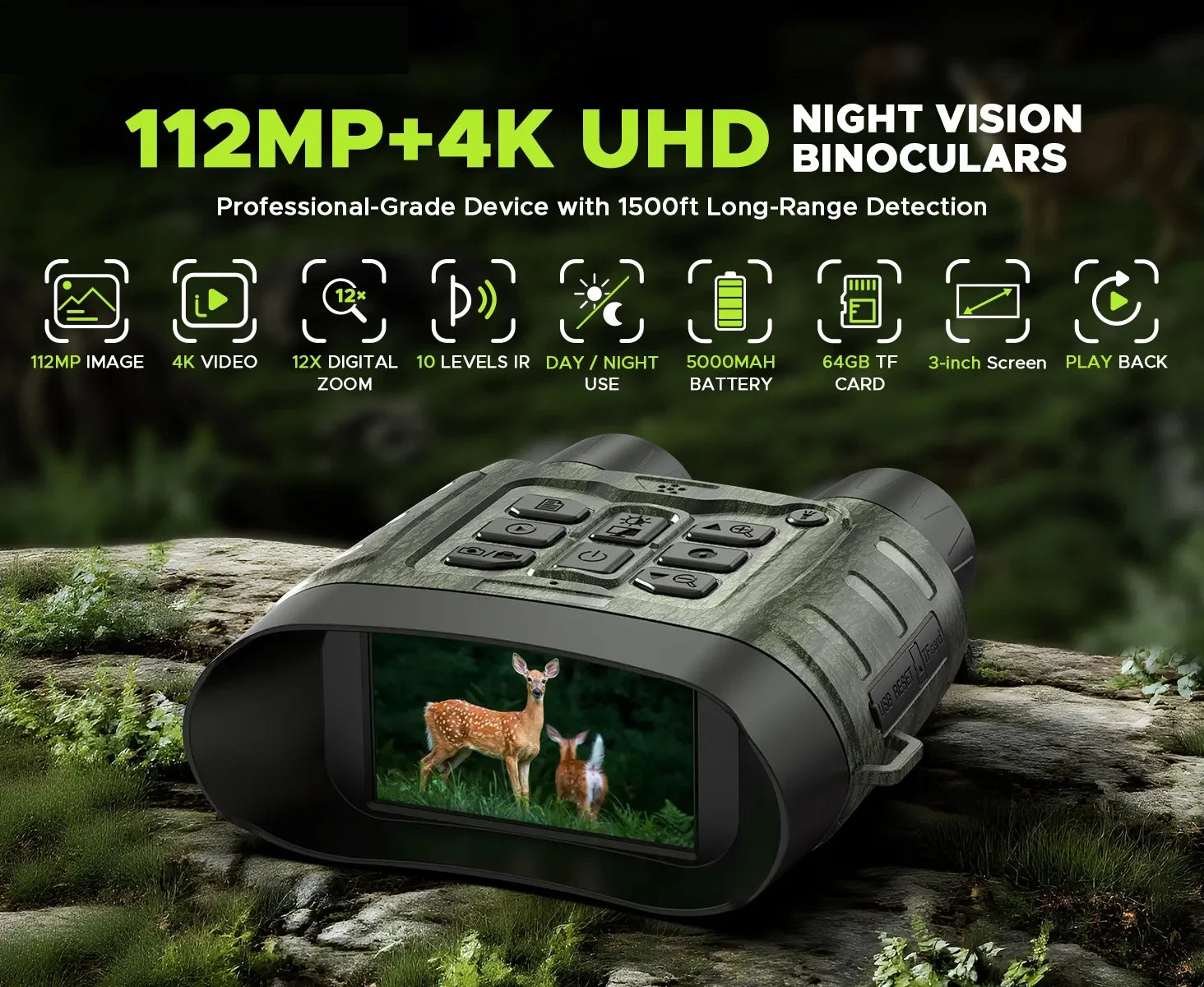Are you ready to elevate your nighttime adventures? Our cutting-edge night vision goggles capture stunning 4K video resolution and 112MP image quality, ensuring you see every detail even in complete darkness.