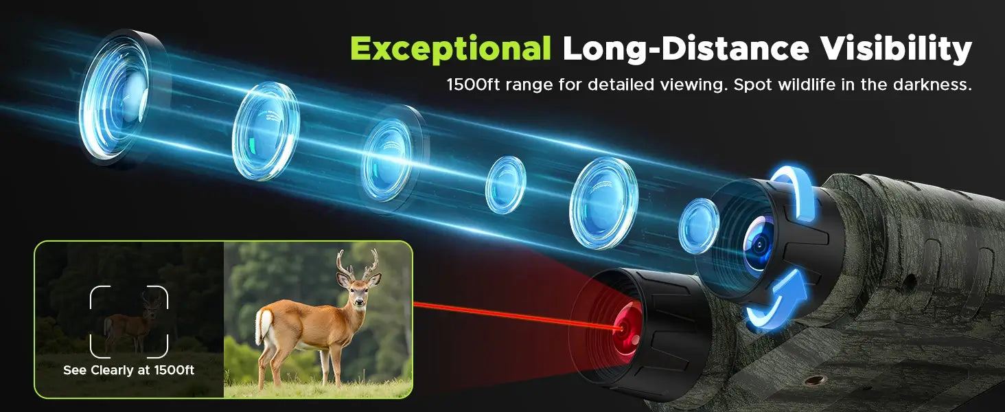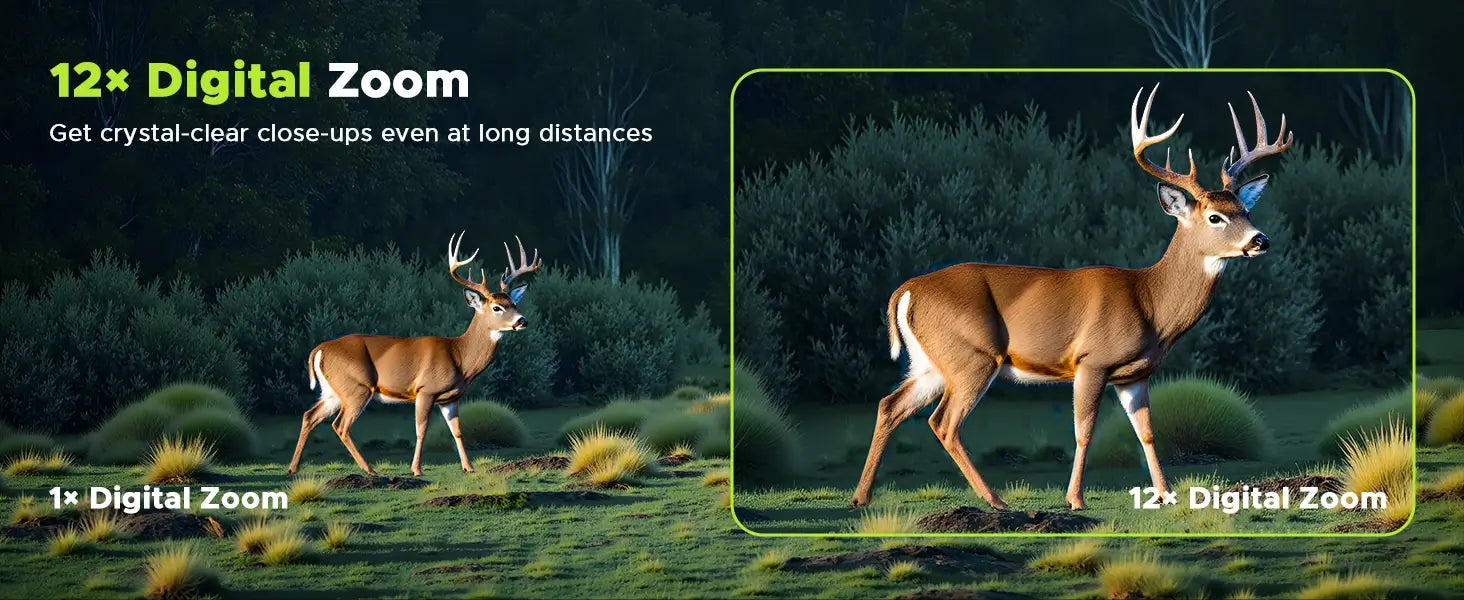 Don't miss a thing with the impressive 12X digital zoom featured in our night vision binoculars, letting you identify targets at 1500ft with razor-sharp clarity. Whether hunting or simply enjoying a nighttime stroll, these 4k night vision binoculars ensure you have the best view possible. Ideal for surveillance, camping, or securing your property after dark.