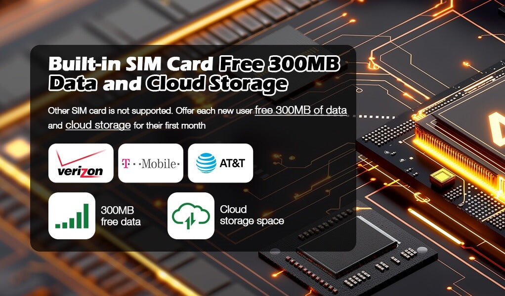 The SIM card is included in the camera, with free 300MB of data and free cloud storage services for the first month Support (Verizon, T-Mobile, and AT&T)