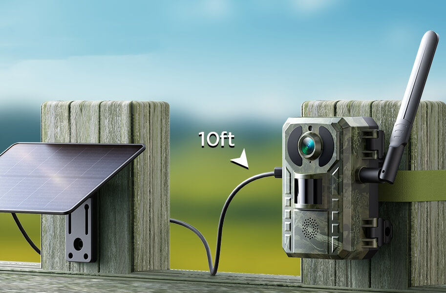 The 10-foot cable between the camera and solar panel allows for flexible placement of the panel in sunnier spots for faster energy conversion