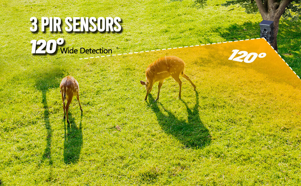Equipped with 3 Passive Infrared Sensors, it detects wildlife more quickly and efficiently than a single sensor, conserving power. The trail camera can swiftly identify wildlife within a 120° detection angle at a super speed of 0.1 seconds, capturing every stunning moment.